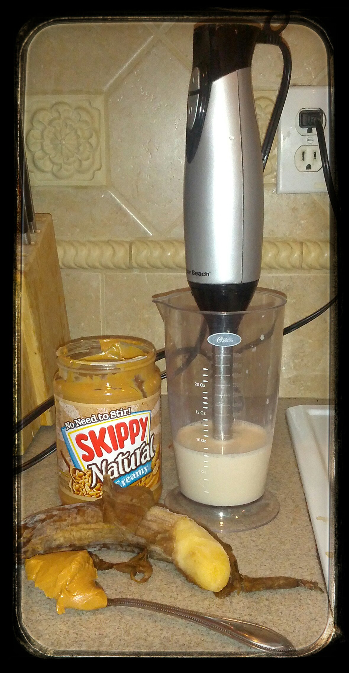 I use a big tall measuring cup, dump all the ingredients in, in goes the blender. Best of all, everyone can have a turn pressing the button (don’t lift it higher than the liquid if blender is on!!)